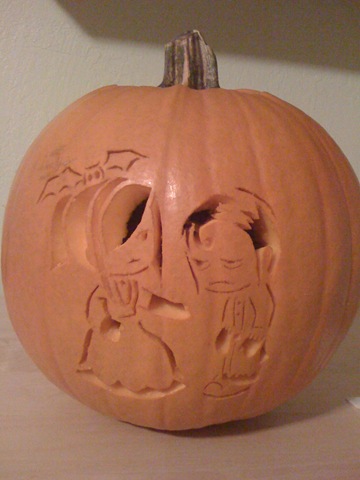 So, I’m off to bed a bit early tonight and hoping to sleep most of tomorrow morning. But, it was all worth it. The pumpkin looks great and I got free movie tickets. Also, I really enjoy taking the time to carve tiny details into a gourd.